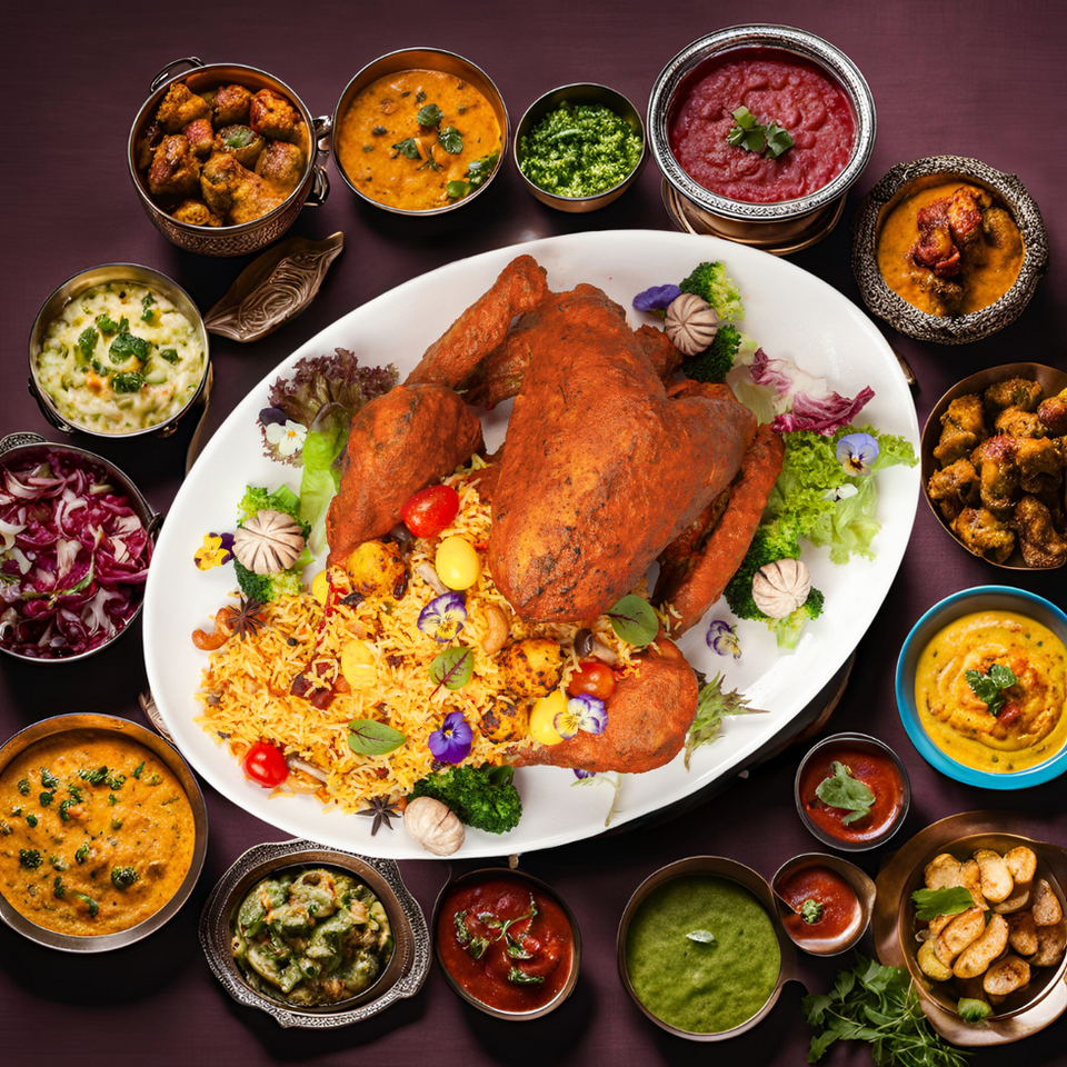 Marinated with an assortment of 16 spices and slow-roasted in a traditional tandoor, Stuffed with Lamb Dum Biryani, Papad Khakhra & Chutney
